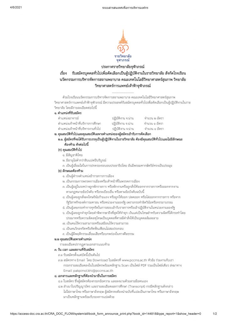 ตำแหน่ง อาจารย์ / เจ้าหน้าที่บริหารการศึกษา / เจ้าหน้าที่บริหารงานทั่วไป สังกัดโรงเรียนนวัตกรรมการบริหารจัดการสถานพยาบาล คณะเทคโนโลยีวิทยาศาสตร์สุขภาพ วิทยาลัยวิทยาศาสตร์การแพทย์เจ้าฟ้าจุฬาภรณ์ 7 เม.ย. 2564 FacebookTwitterLine เนื้อหาประกาศDownload คลิกเพื่อดาวน์โหลดแบบฟอร์มใบสมัครงาน >> ดาวน์โหลด คลิกเพื่อดาวน์โหลดแบบฟอร์มทดสอบทางอารมณ์ EQ TEST >> ดาวน์โหลด