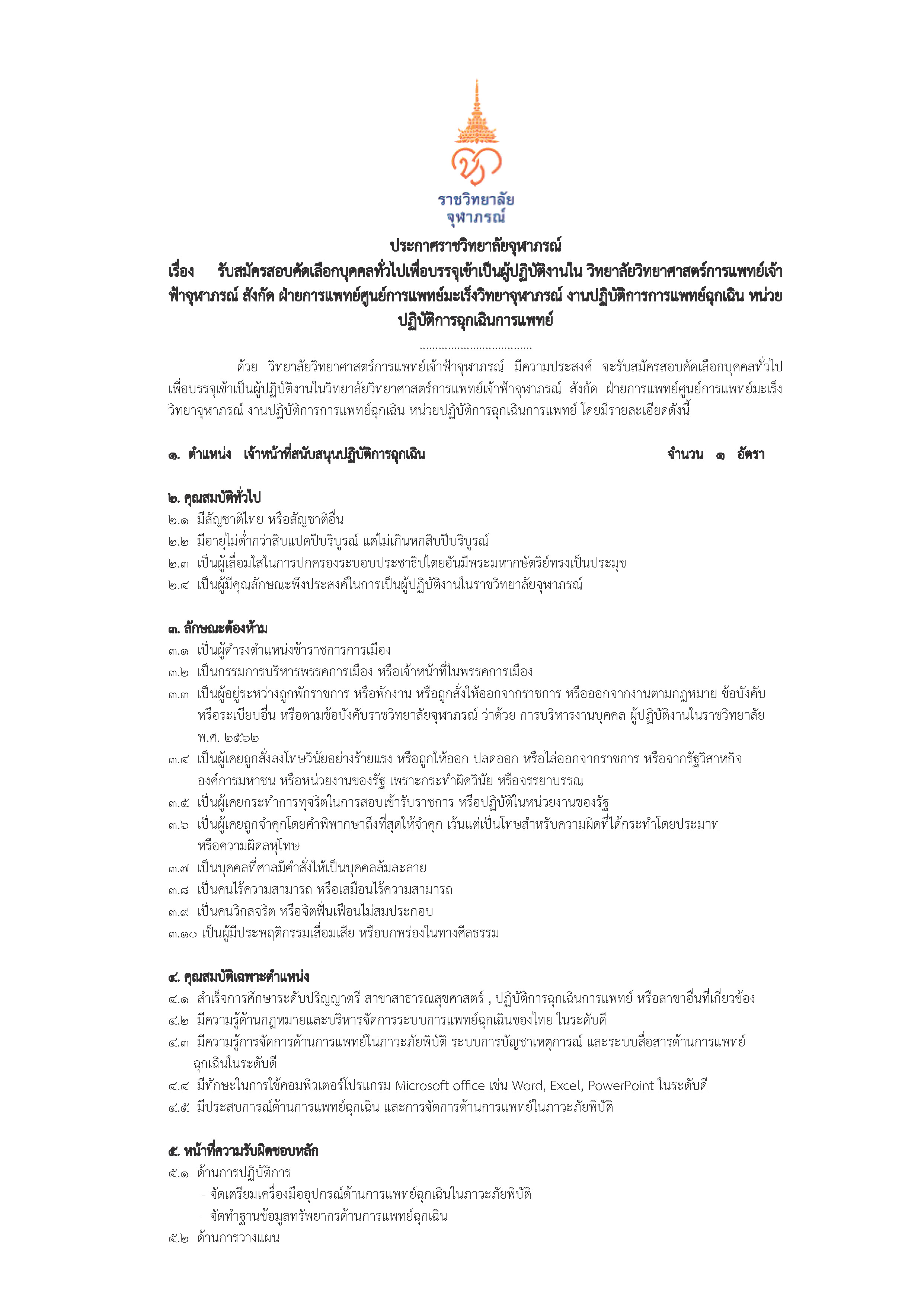 ตำแหน่ง เจ้าหน้าที่สนับสนุนปฏิบัติการฉุกเฉิน สังกัด ฝ่ายการแพทย์ศูนย์การแพทย์มะเร็งวิทยาจุฬาภรณ์ งานปฏิบัติการการแพทย์ฉุกเฉิน หน่วยปฏิบัติการฉุกเฉินการแพทย์ 25 มิ.ย. 2563 FacebookTwitterLine รายละเอียด แบบฟอร์มการสมัคร