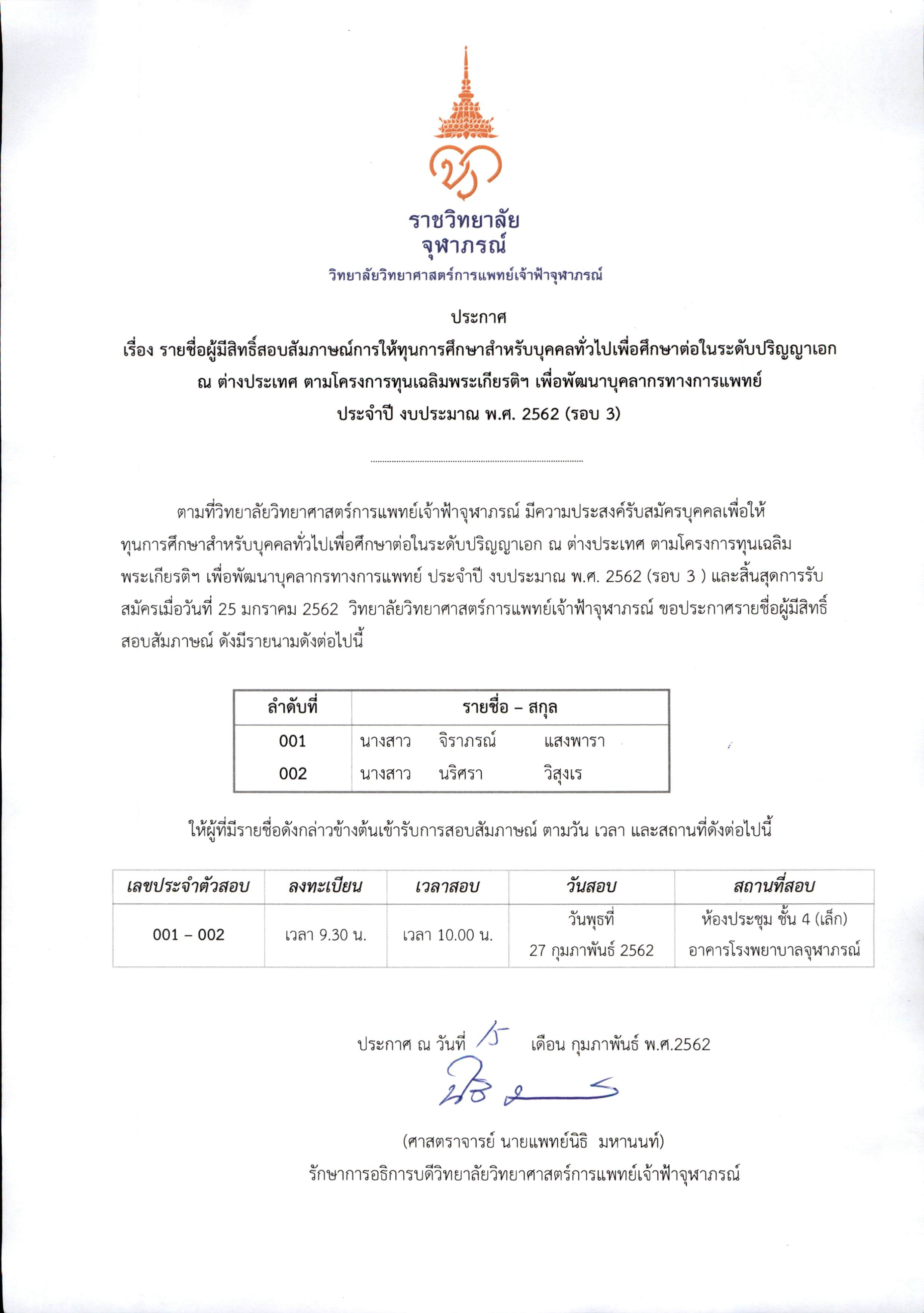 ประกาศรายชื่อผู้มีสิทธิ์สัมภาษณ์การให้ทุนการศึกษาสำหรับบุคคลทั่วไปเพื่อศึกษาต่อในระดับปริญญาเอก ณ ต่างประเทศ ตามโครงการทุนเฉลิมพระเกียรติฯ เพื่อพัฒนาบุคลากรทางการแพทย์ ประจำปีงบประมาณ พ.ศ. 2562 (รอบ 3) 20 ก.พ. 2562 FacebookTwitterLine ดาวน์โหลดรายละเอียด