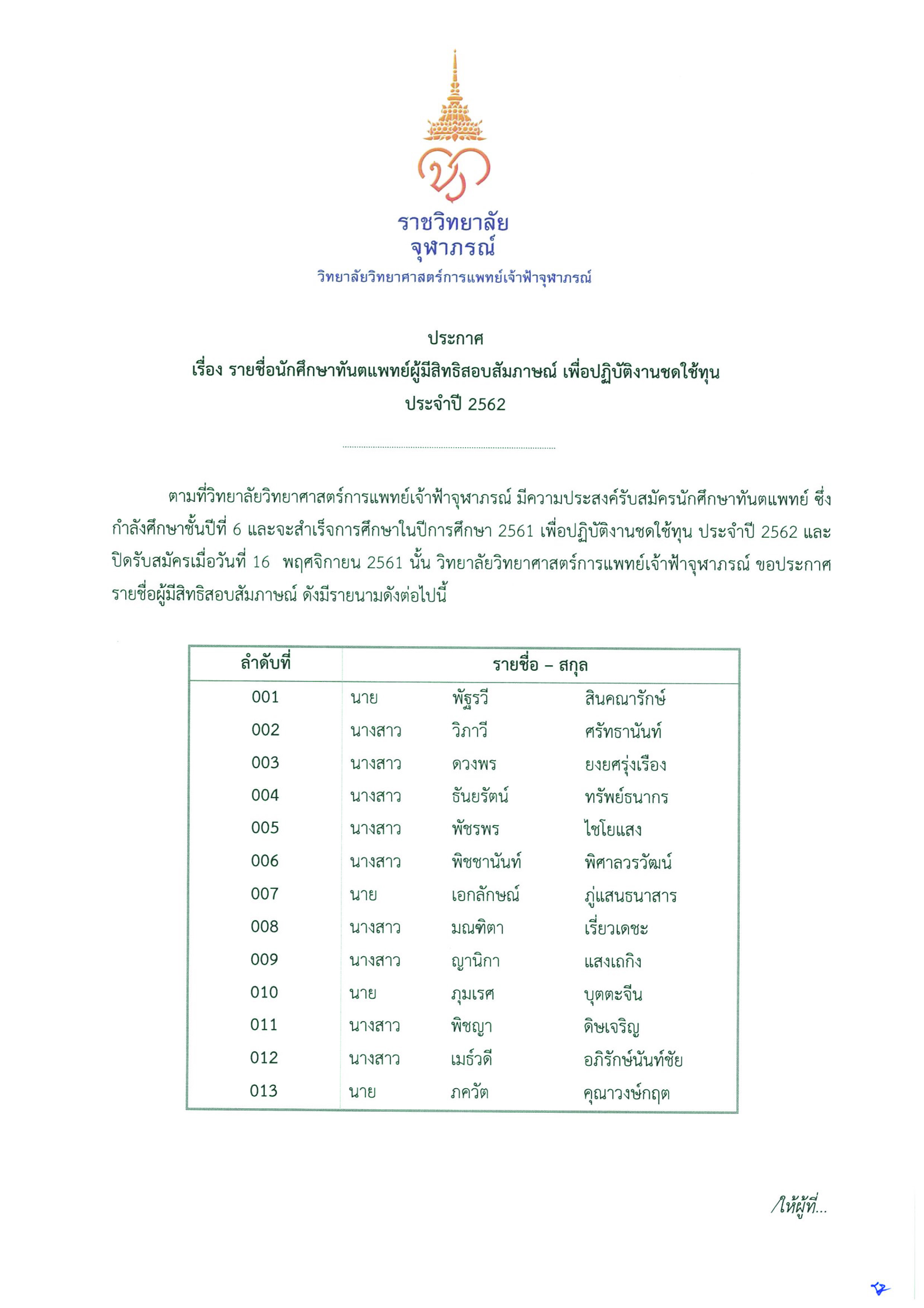 ประกาศ รายชื่อผู้มีสิทธิ์สอบสัมภาษณ์ทันตแพทย์เพื่อปฏิบัติงานชดใช้ทุน ประจำปีการศึกษา 2562 20 พ.ย. 2561 FacebookTwitterLine ดาวน์โหลด PDF / Download PDF