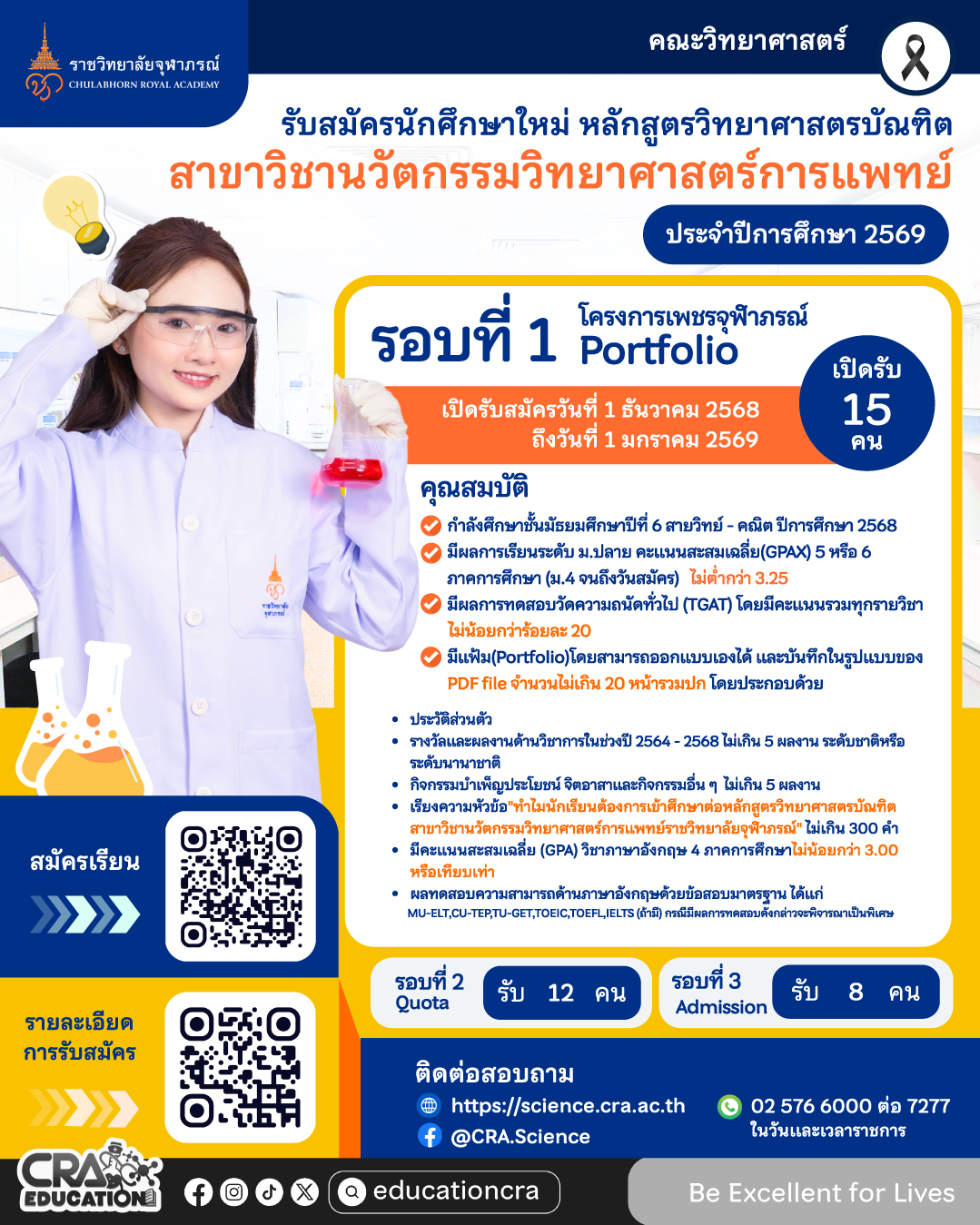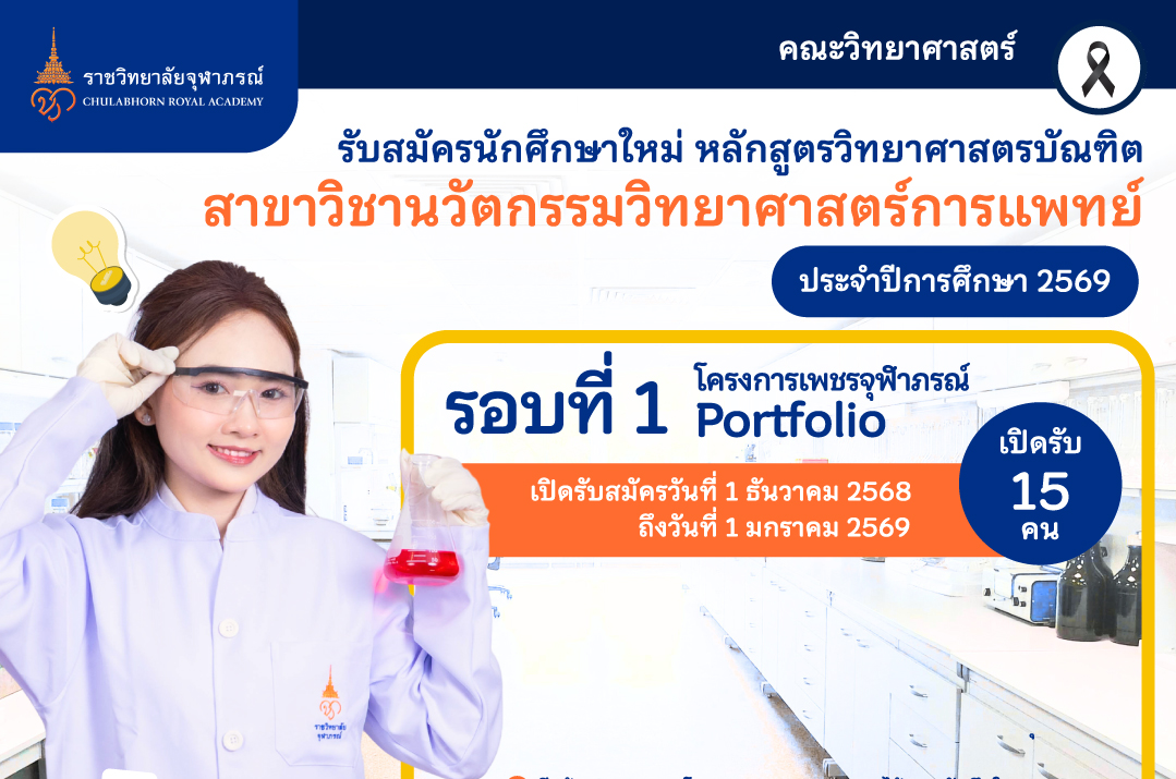 ราชวิทยาลัยจุฬาภรณ์ คณะวิทยาศาสตร์ เปิดรับสมัครนักศึกษาใหม่ หลักสูตรวิทยาศาสตรบัณฑิต สาขาวิชานวัตกรรมวิทยาศาสตร์การแพทย์ ประจำปีการศึกษา 2569 ใน รอบที่ 1 Portfolio