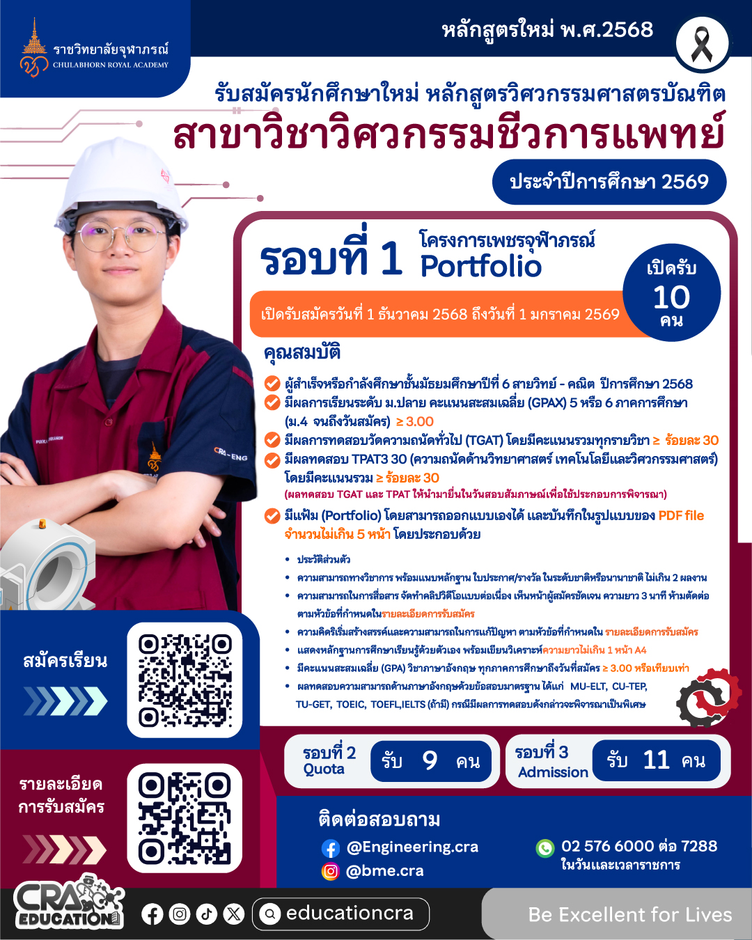 ราชวิทยาลัยจุฬาภรณ์ เปิดรับสมัครนักศึกษาใหม่ หลักสูตรวิทยาศาสตรบัณฑิต สาขาวิชาวิศวกรรมชีวการแพทย์ (หลักสูตรใหม่ พ.ศ. 2568) ประจำปีการศึกษา 2569 ใน รอบที่ 1 Portfolio (โครงการเพชรจุฬาภรณ์)