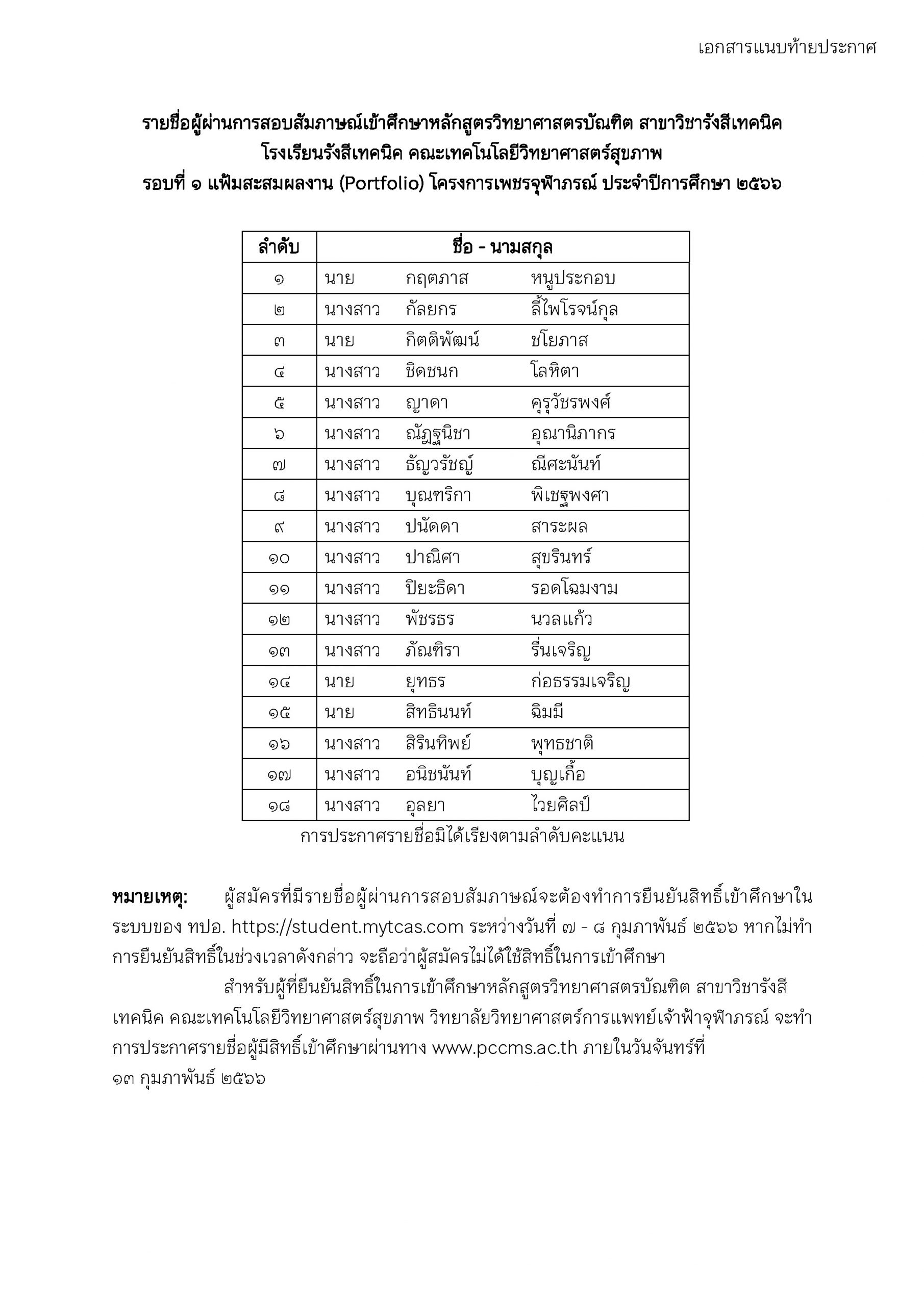 ประกาศรายชื่อผู้ผ่านการสอบสัมภาษณ์เข้าศึกษาหลักสูตรวิทยาศาสตรบัณฑิต สาขารังสีเทคนิค รอบที่ ๑ แฟ้มสะสมผลงาน ประจำปีการศึกษา ๒๕๖๖ 31 ม.ค. 2566 FacebookTwitterLine