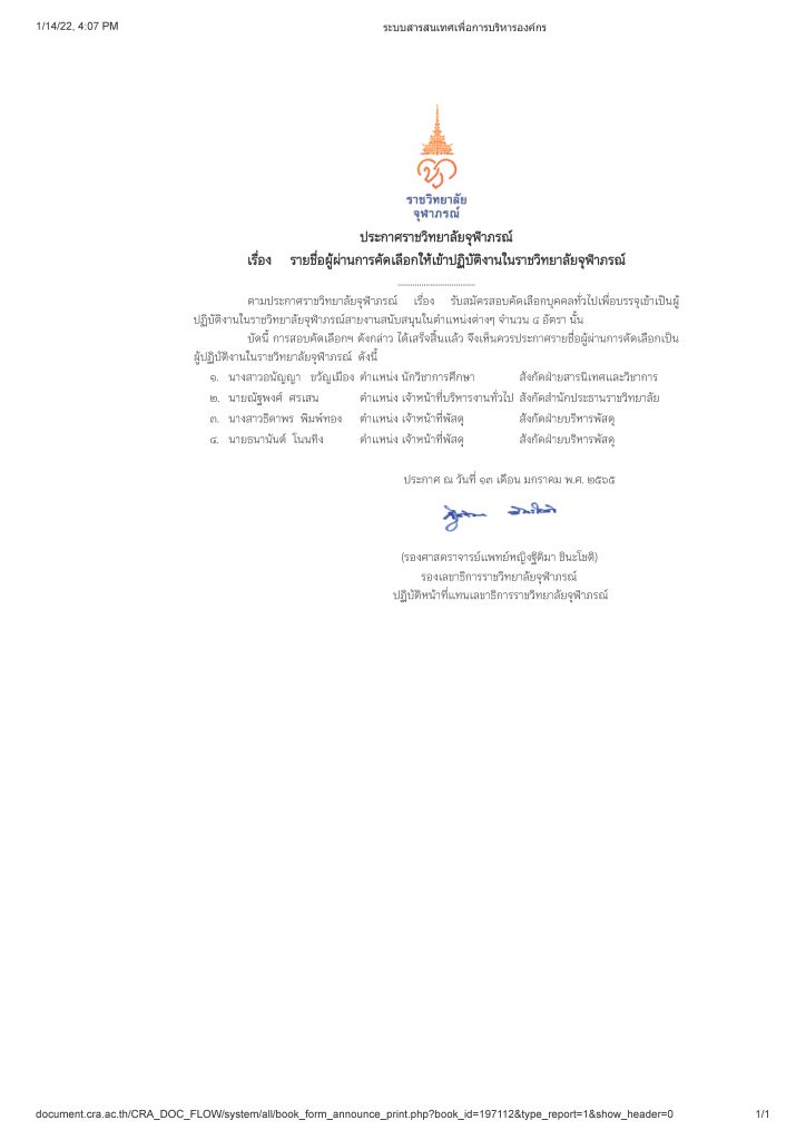 ประกาศ รายชื่อผู้ผ่านการคัดเลือกให้เข้าปฏิบัติงานในราชวิทยาลัยจุฬาภรณ์ ตำแหน่ง นักวิชาการศึกษา เจ้าหน้าที่บริหารงานทั่วไป และเจ้าหน้าที่พัสดุ 19 ม.ค. 2565 FacebookTwitterLine รายชื่อผู้ผ่านการคัดเลือกให้เข้าปฏิบัติงานในราชวิทยาลัยจุฬาภรณ์Download