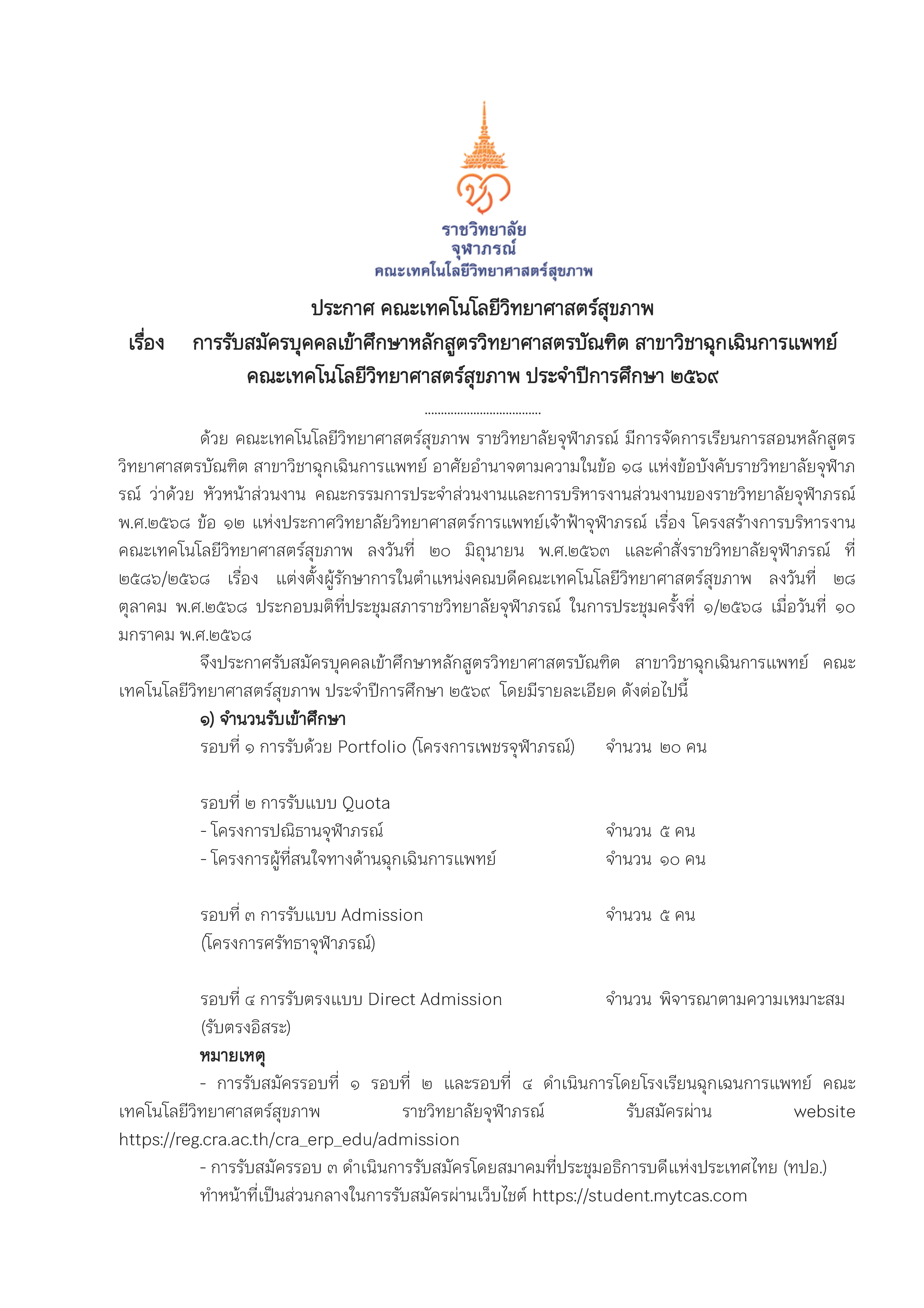 ประกาศ คณะเทคโนโลยีวิทยาศาสตร์สุขภาพ เรื่อง การรับสมัครบุคคลเข้าศึกษาหลักสูตรวิทยาศาสตรบัณฑิต สาขาวิชาฉุกเฉินการแพทย์ คณะเทคโนโลยีวิทยาศาสตร์สุขภาพ ประจำปีการศึกษา ๒๕๖๙ 3 พ.ย. 2568 FacebookTwitterLine รับสมัครบุคคลเข้าศึกษาหลักสูตรวิทยาศาสตรบัณฑิต สาขาวิชาฉุกเฉินการแพทย์Download
