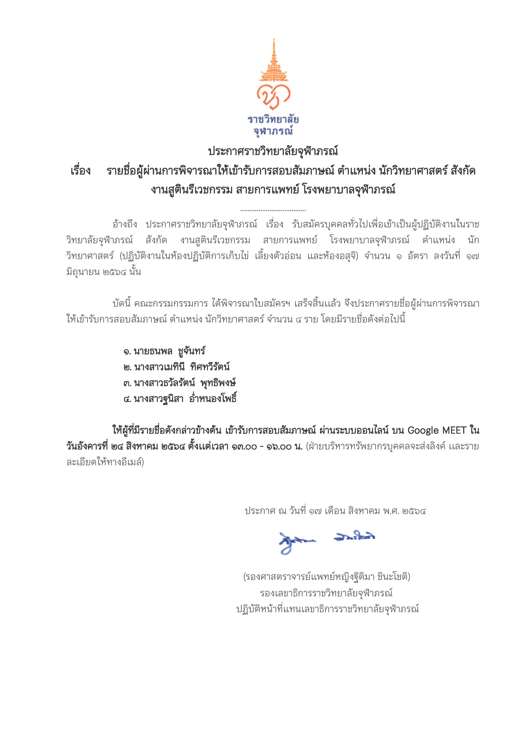 ประกาศ รายชื่อผู้ผ่านการพิจารณาให้เข้ารับการสอบสัมภาษณ์ ตำแหน่ง นักวิทยาศาสตร์ สังกัด งานสูตินรีเวชกรรม สายการแพทย์ โรงพยาบาลจุฬาภรณ์ 19 ส.ค. 2564 FacebookTwitterLine รายชื่อผู้ผ่านการพิจารณาให้เข้ารับการสอบสัมภาษณ์ ตำแหน่ง นักวิทยาศาสตร์Download