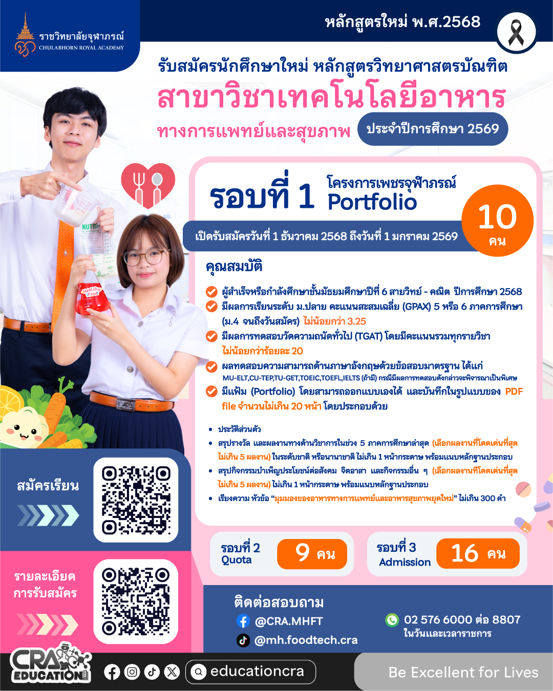 ราชวิทยาลัยจุฬาภรณ์ เปิดรับสมัครนักศึกษาใหม่ หลักสูตรวิทยาศาสตรบัณฑิต สาขาวิชาเทคโนโลยีอาหารทางการแพทย์และสุขภาพ ประจำปีการศึกษา 2569 ใน รอบที่ 1 Portfolio (โครงการเพชรจุฬาภรณ์)