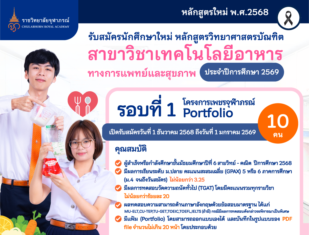 ราชวิทยาลัยจุฬาภรณ์ เปิดรับสมัครนักศึกษาใหม่ หลักสูตรวิทยาศาสตรบัณฑิต สาขาวิชาเทคโนโลยีอาหารทางการแพทย์และสุขภาพ ประจำปีการศึกษา 2569 ใน รอบที่ 1 Portfolio (โครงการเพชรจุฬาภรณ์)