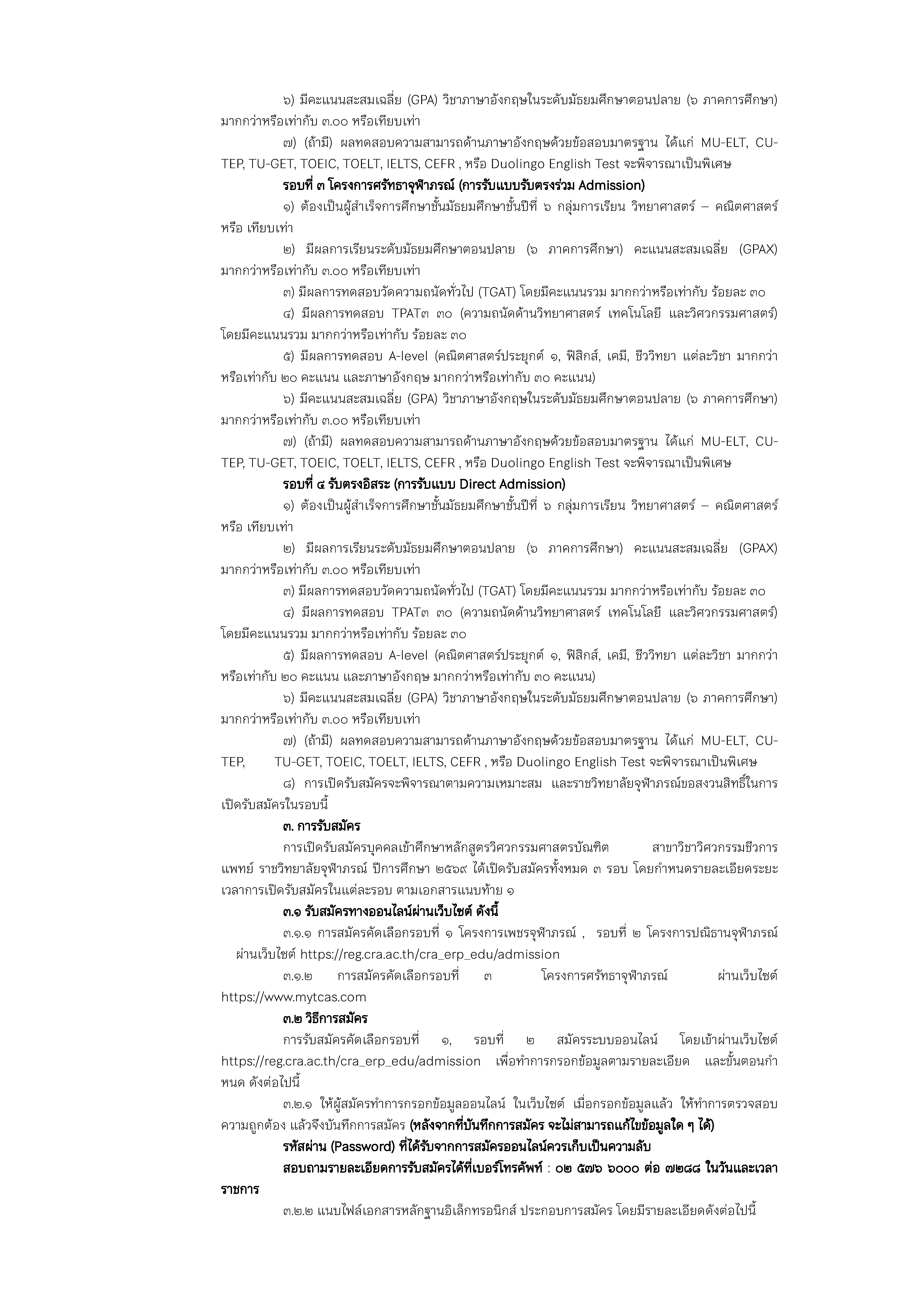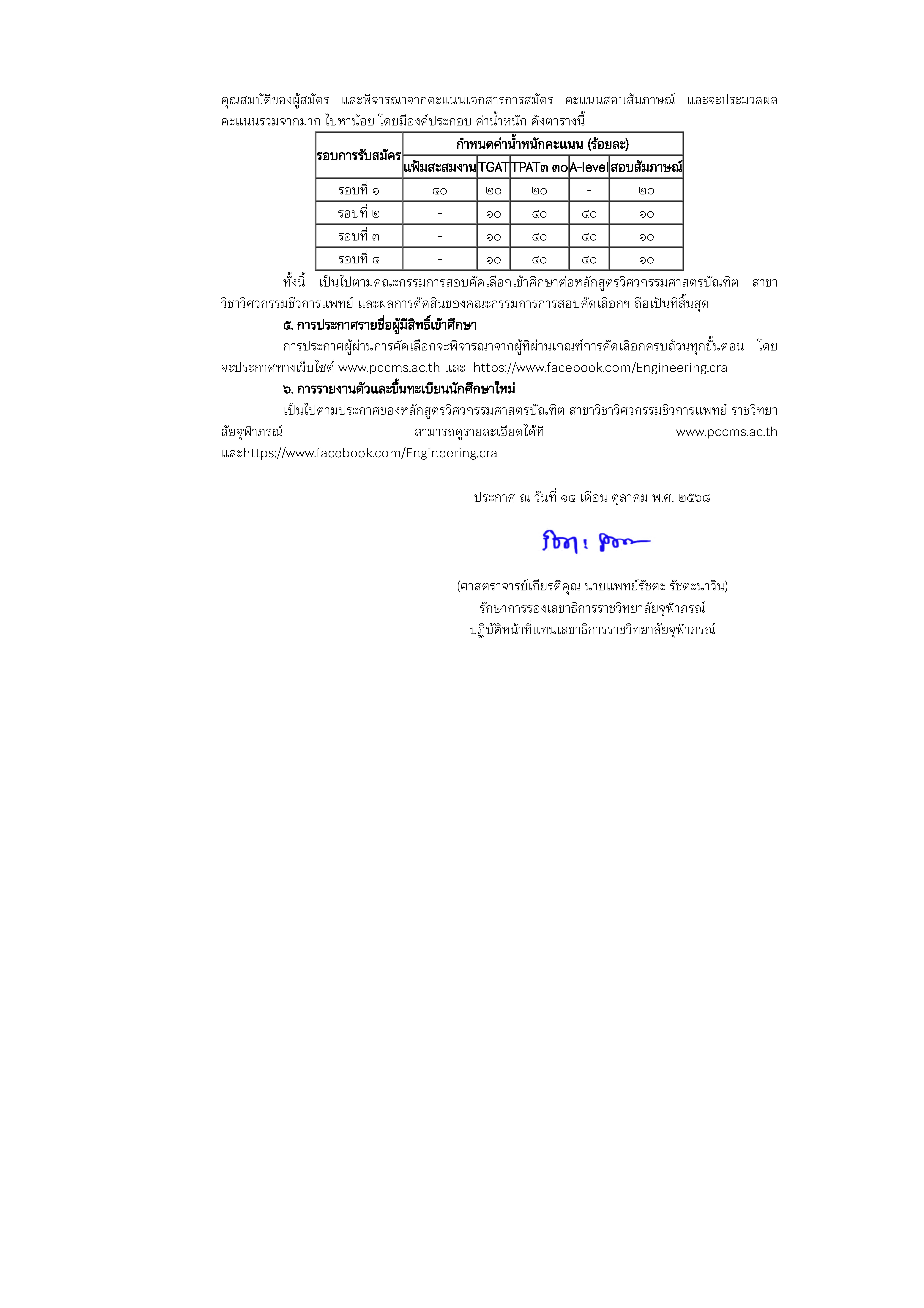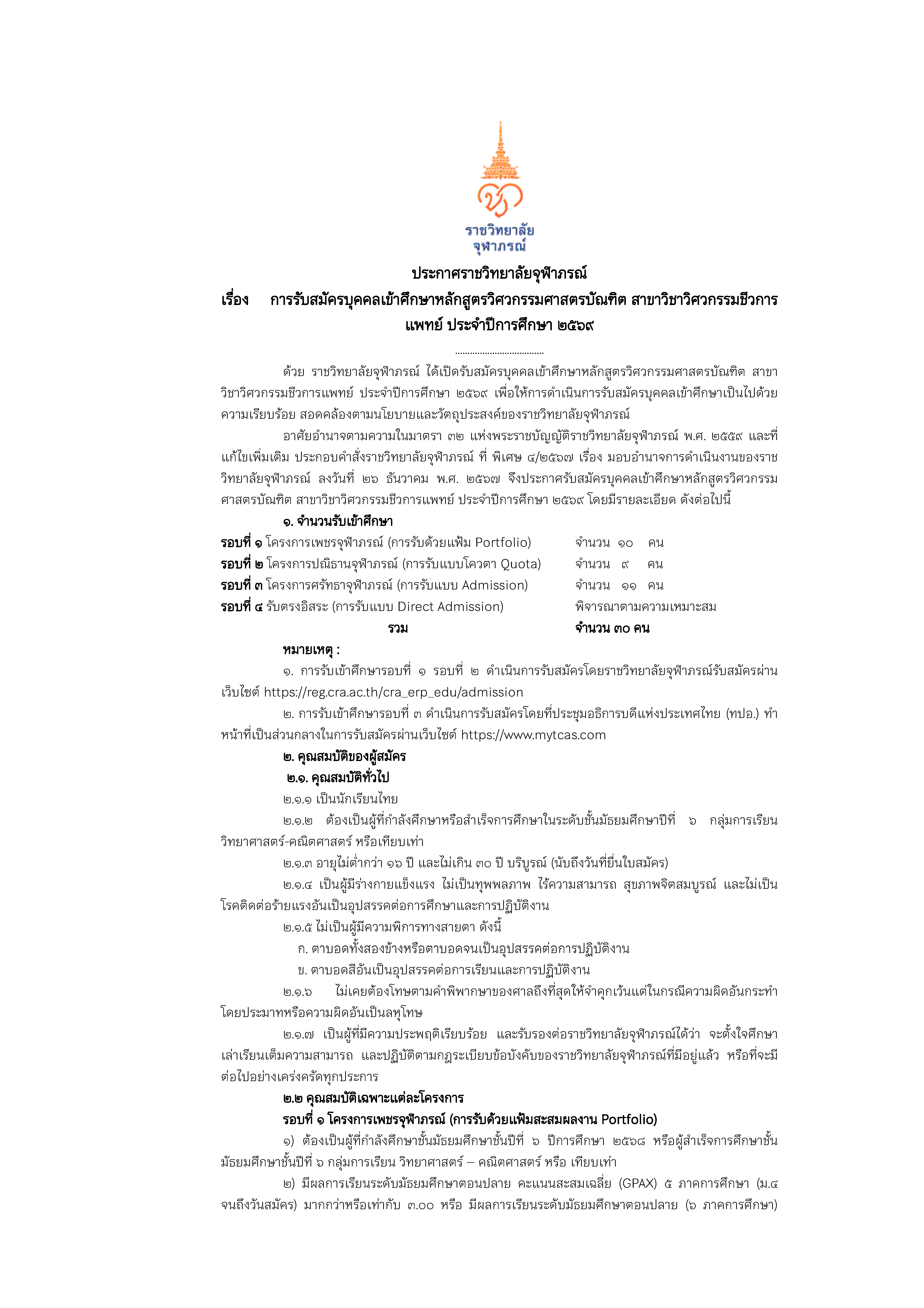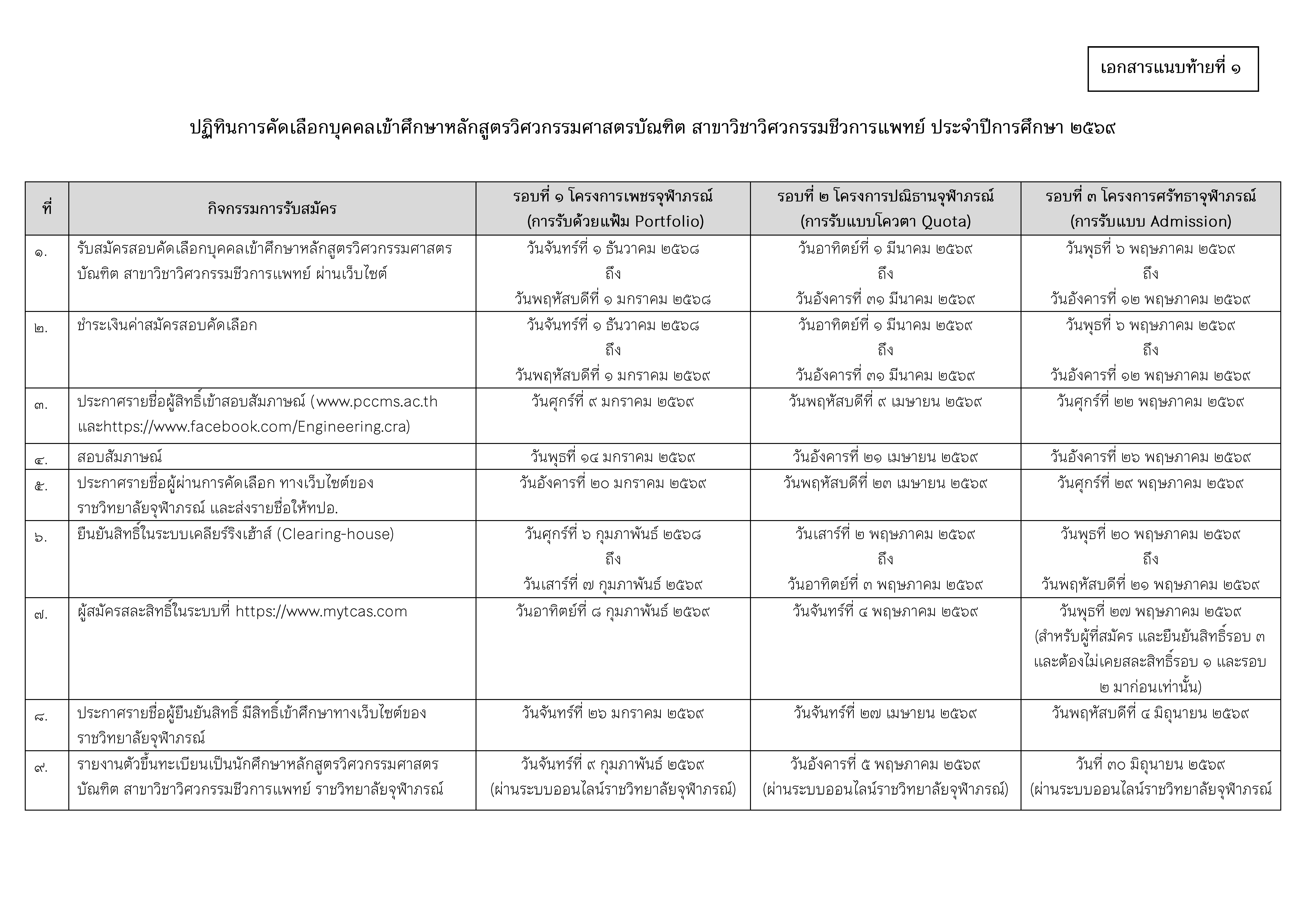 ประกาศ ราชวิทยาลัยจุฬาภรณ์ เรื่อง การรับสมัครบุคคลเข้าศึกษาหลักสูตรวิศวกรรมศาสตรบัณฑิต สาขาวิชาวิศวกรรมชีวการแพทย์ ประจำปีการศึกษา ๒๕๖๘ 17 ต.ค. 2568 FacebookTwitterLine วิการรับสมัครบุคคลเข้าศึกษาหลักสูตรวิศวกรรมศาสตรบัณฑิตDownload ปฎิทินการรับสมัครDownload